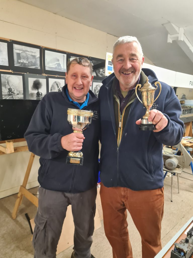 At our modelling competition & mince pie night there were some very good examples of kit built “00” & N gauge wagons and some kit built & scratch built buildings & an agricultural plough. Thanks to Bob for the mince pies. Chairman Andy Wilkinson presented the David Townson Memorial Trophy to Brian Smith for his train of “00” empty coal wagons an the Peter Barker Memorial Cup for buildings & scenery to Terry Metcalfe for his scratch built model of Soham station in N gauge.